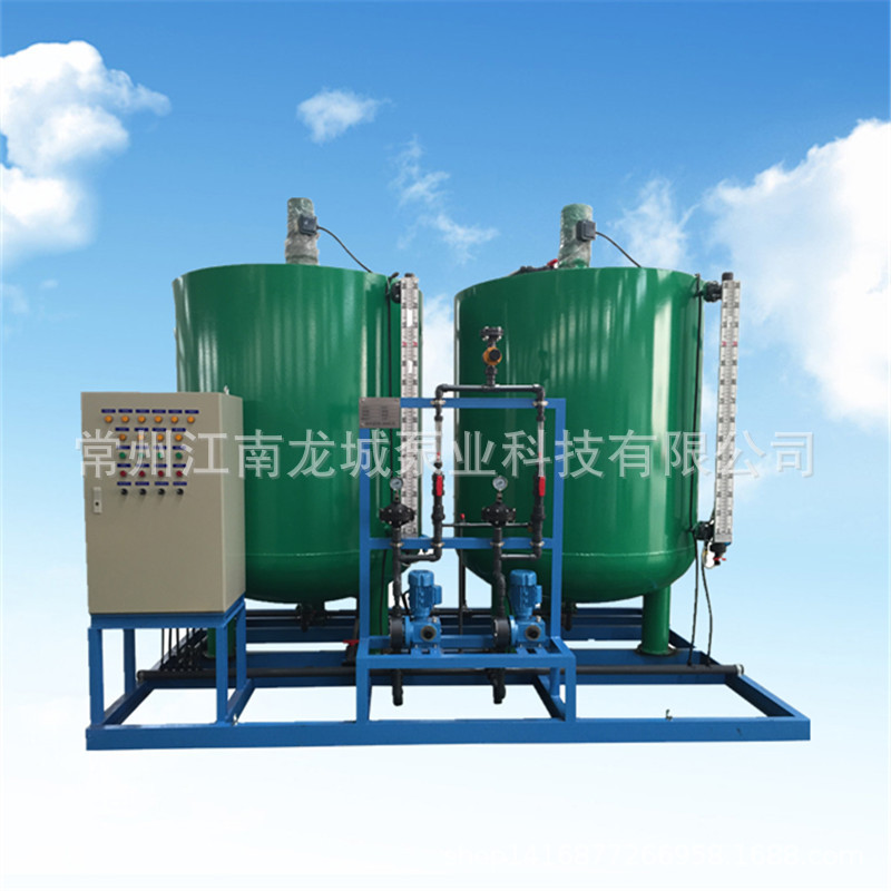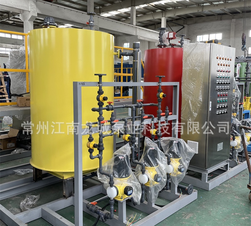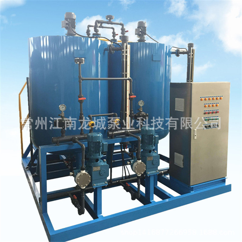 本装置固体药剂加入溶药箱内,然后按比例加入工业水搅拌溶解,由计量投加系统投加到投药点。投加控制可采用手动方式,也可依据上位系统输出的控制信号,进行随动控制,自动投加。