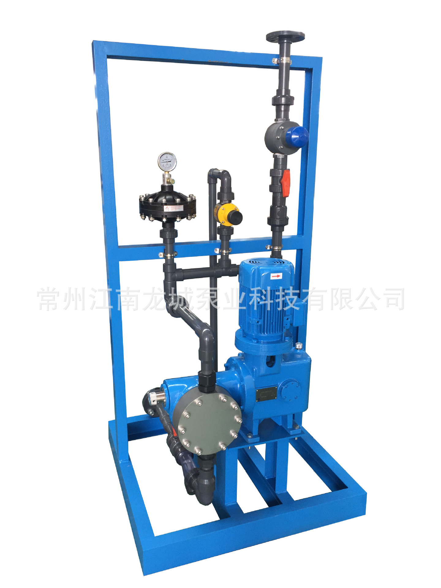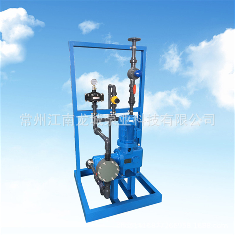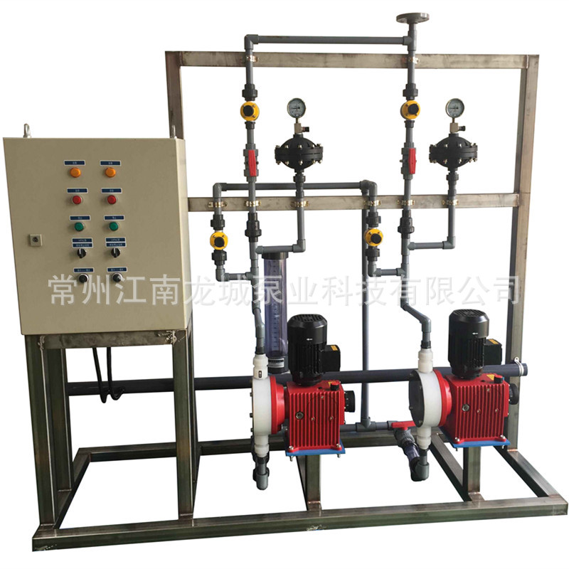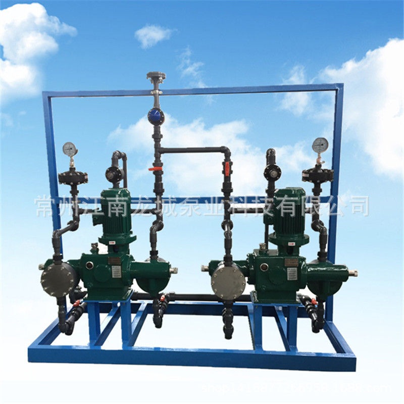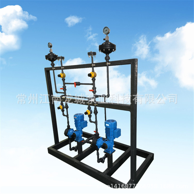 根据用户要求将计量泵组合在一个框架上,所有计量泵附件(包含缓冲器、压力表、安全阀、截止阀、进出口法兰等等)全部安装好,减少了现场安装的工作量。设备到现场只需要进口接入进液罐,出口接入系统就可使用。如有备用泵,备用泵跟其他泵的出口都可以单独连接好,省去现场重新连接跟每台泵的备用管道和阀门。材质有PVC 304不锈钢 316不锈钢