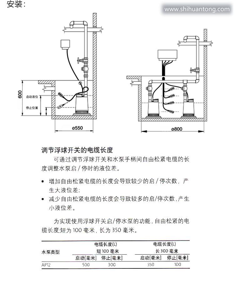 配分开安装的液位开关和控制箱的水泵(三相泵),可在两种高度的液位间进行自动启/停运行。