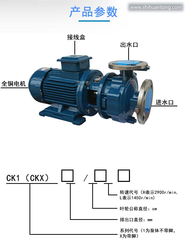 CK1、CKX型泵是单级单吸悬臂直联式离心泵。供输送清水及物理、化学性质类似于水的液体。泵过流部件如采用不锈钢也可输送部分腐蚀性液体。输送液体温度不得超过80℃,适合工厂、矿山、城市、电站的给排水、空调、农田排涝灌溉和各种水利工程。
