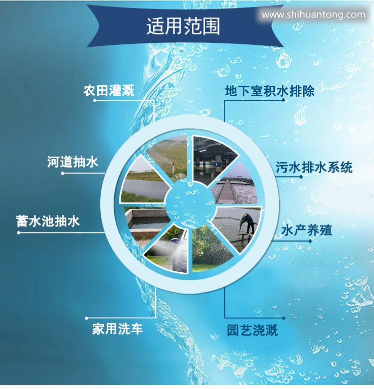 小型污水处理设施或净化槽的污水转移,家庭、工厂的防洪排水,工地污水排放,人造自然景观及鱼池供水、农业系统等。