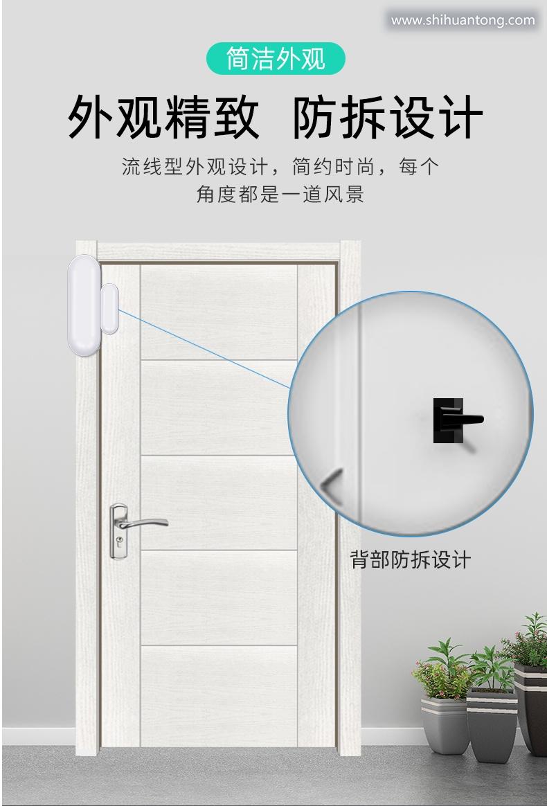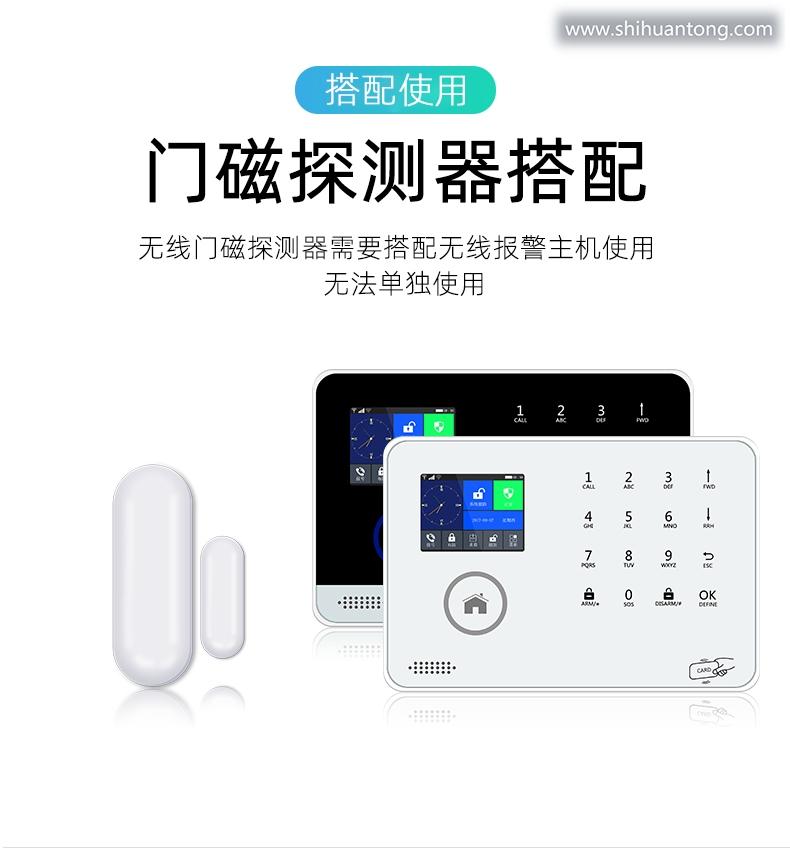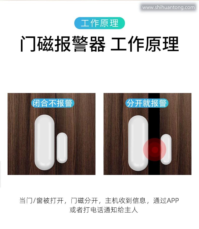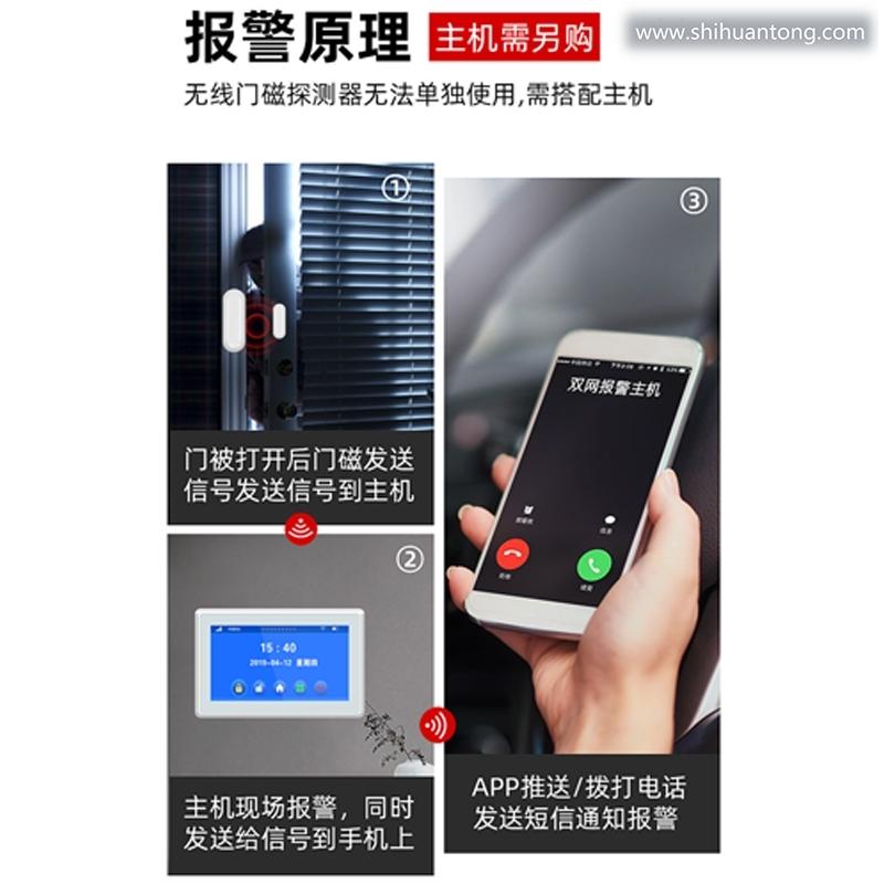 门磁分离报警功能:当无线门磁探测器A (发射器)和无线门磁探测器B (磁铁)分离时,瞬间指示灯闪亮1秒,并立刻发出报警信号给报警主机;低电提醒功能:当无线门磁电压过低时,门磁会每隔3秒闪烁一下红色指示灯,同时发出低电信号给报警主机,报警主机会有语音提示“XX防区电量不足” 提示您应该更换电池了;防拆功能:无线门磁探测器A (发射器)的背面有防拆按键,当把发射器拆下时,防拆按键会被触发,瞬间指示灯闪亮1秒,并立刻发出报警信号给报警门窗未关提醒功能:若有无线门磁处于分离状态,你外出布防时,报警主机不能布防,且有语音提示”XX防区开“ ;提醒您有门窗未关好。