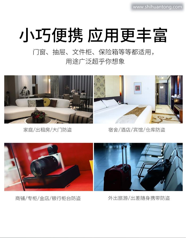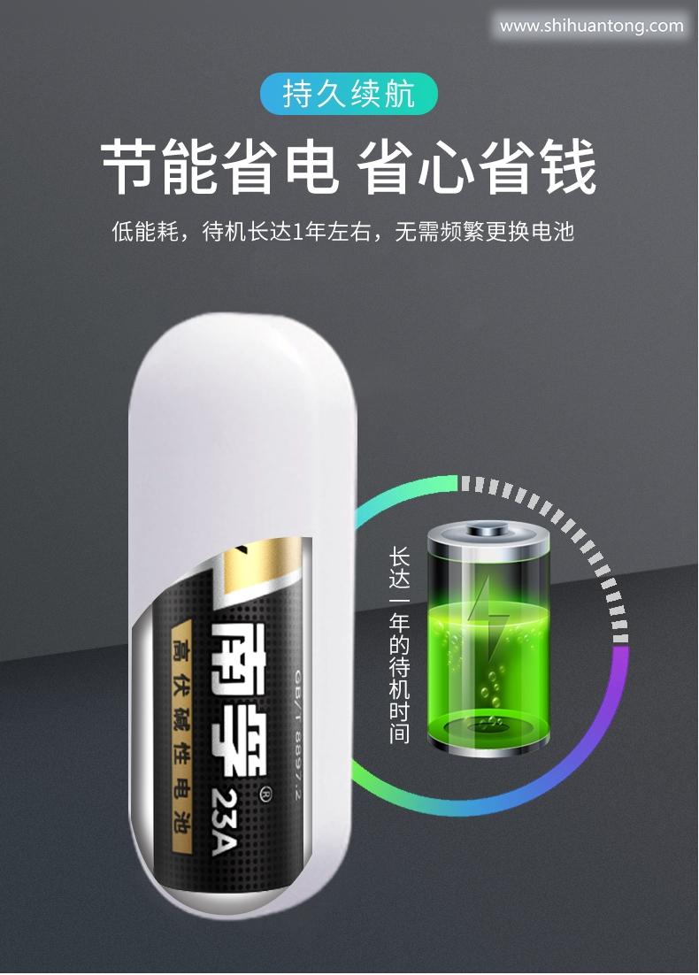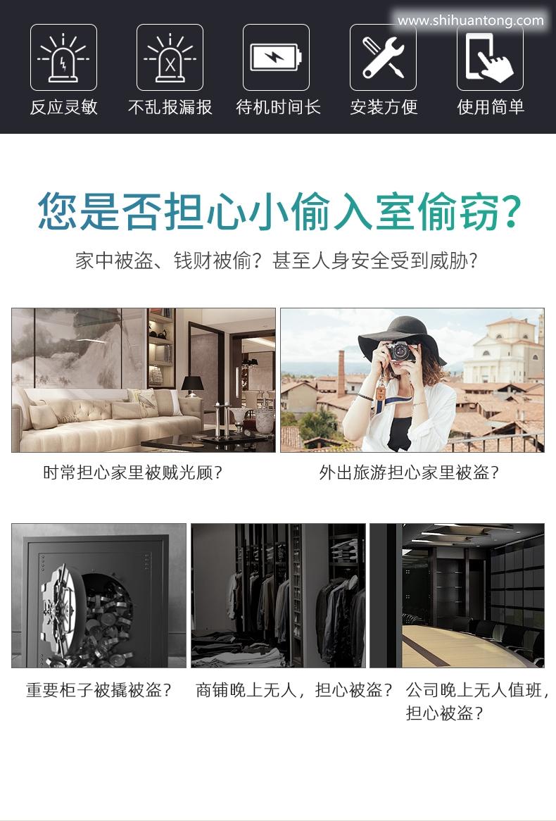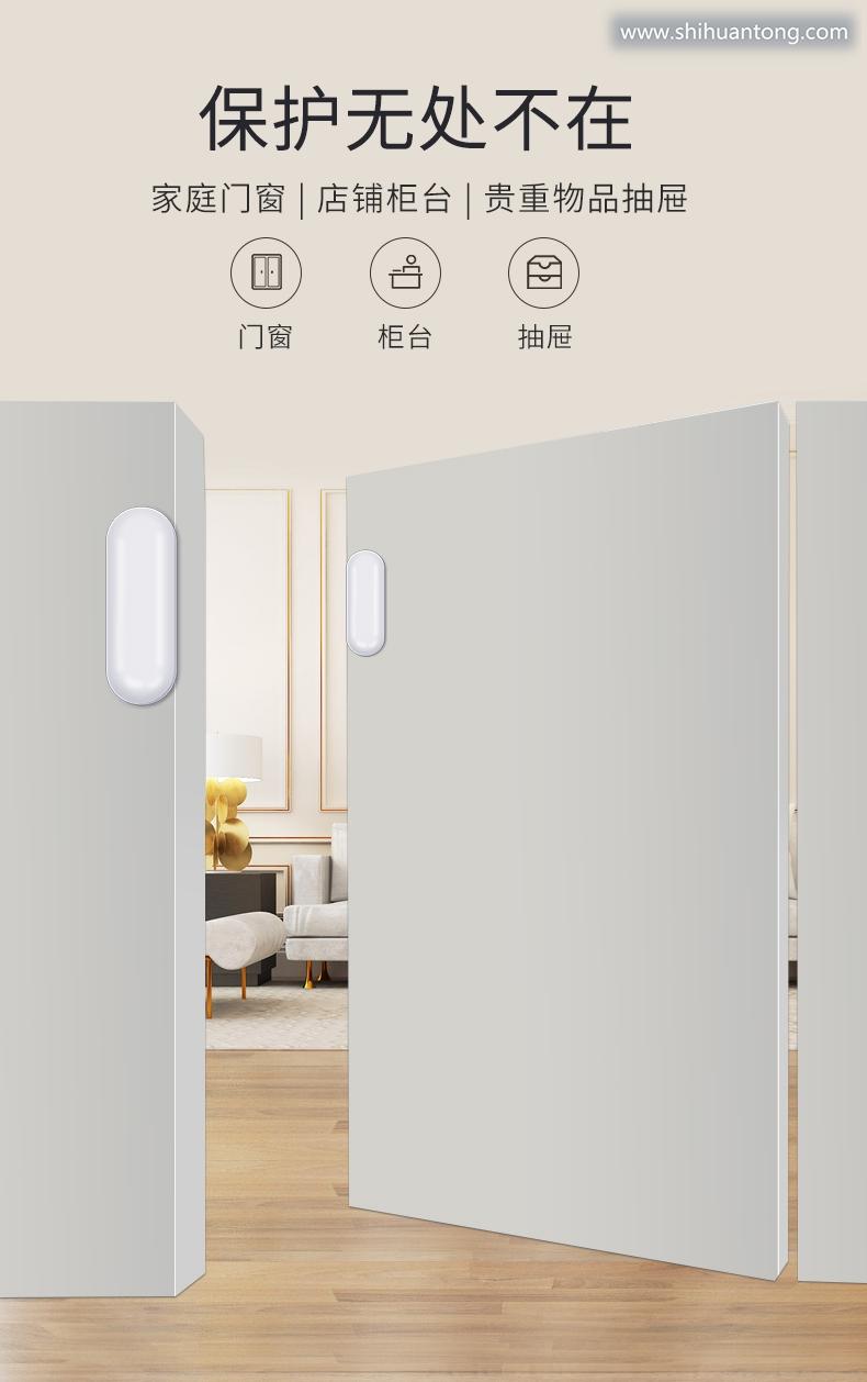 门磁分离报警功能:当无线门磁探测器A (发射器)和无线门磁探测器B (磁铁)分离时,瞬间指示灯闪亮1秒,并立刻发出报警信号给报警主机;低电提醒功能:当无线门磁电压过低时,门磁会每隔3秒闪烁一下红色指示灯,同时发出低电信号给报警主机,报警主机会有语音提示“XX防区电量不足” 提示您应该更换电池了;防拆功能:无线门磁探测器A (发射器)的背面有防拆按键,当把发射器拆下时,防拆按键会被触发,瞬间指示灯闪亮1秒,并立刻发出报警信号给报警门窗未关提醒功能:若有无线门磁处于分离状态,你外出布防时,报警主机不能布防,且有语音提示”XX防区开“ ;提醒您有门窗未关好。