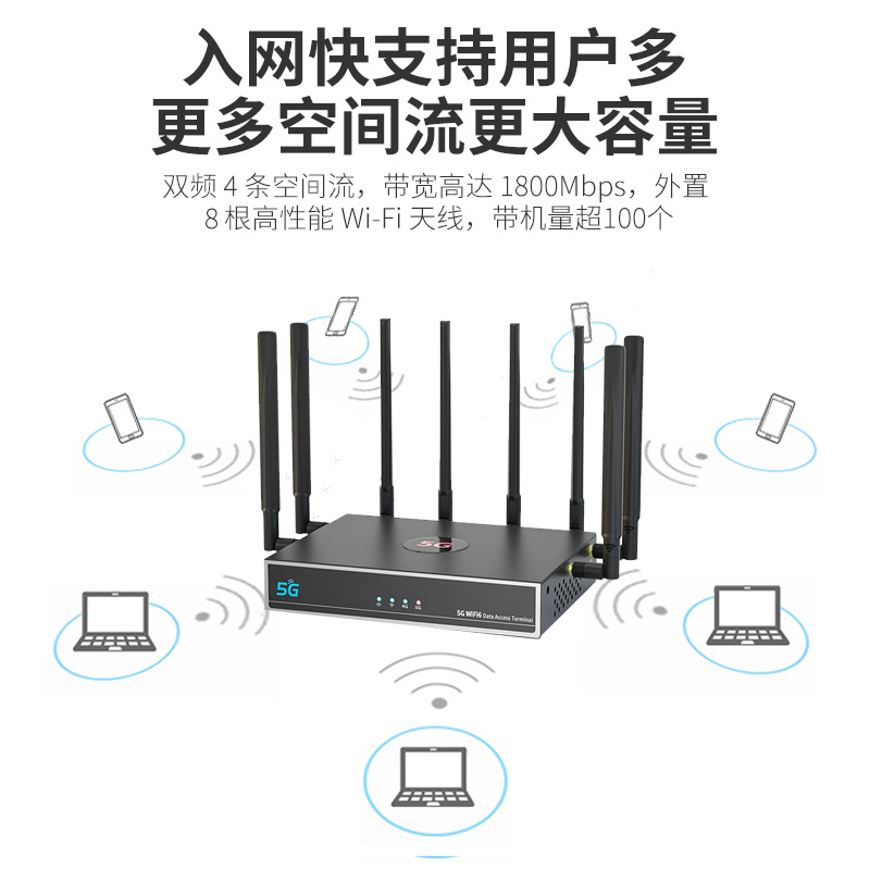 5G & WiFi-6智能无线接入型路由器(CPE)基于全新的硬件平台开发,可满足日益增长的移动终端和IOT物联网节点的接入需求,能极大地提高用户的无线上网使用体验。