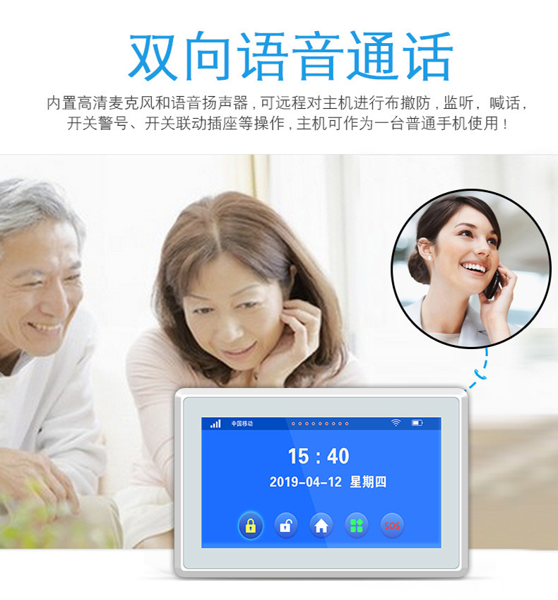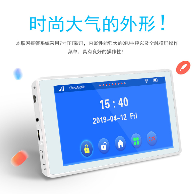 产品功能:本7寸TFT彩屏智能无线远距离语音报警系统G7,内嵌性能强大的CPU主控以及全触摸屏操作菜单,具有良好的操作性,内嵌高质量真人语音芯片及精确的时钟芯片,是一款高端的GSM/WIFI双网报警器,性能稳定可靠。主机无线连接红外,门磁,烟雾探测器,燃气探测器,紧急按钮等配件。报警器接到警情时,会在彩屏上显示报警防区,现场发出警报声,同时发短信和拨打用户预设的电话通知用户。可广泛应用于家庭、工厂、学校、商铺、便利店、财务室、别墅、小区等需要防护的地方,以便保障人身及财产的安全。