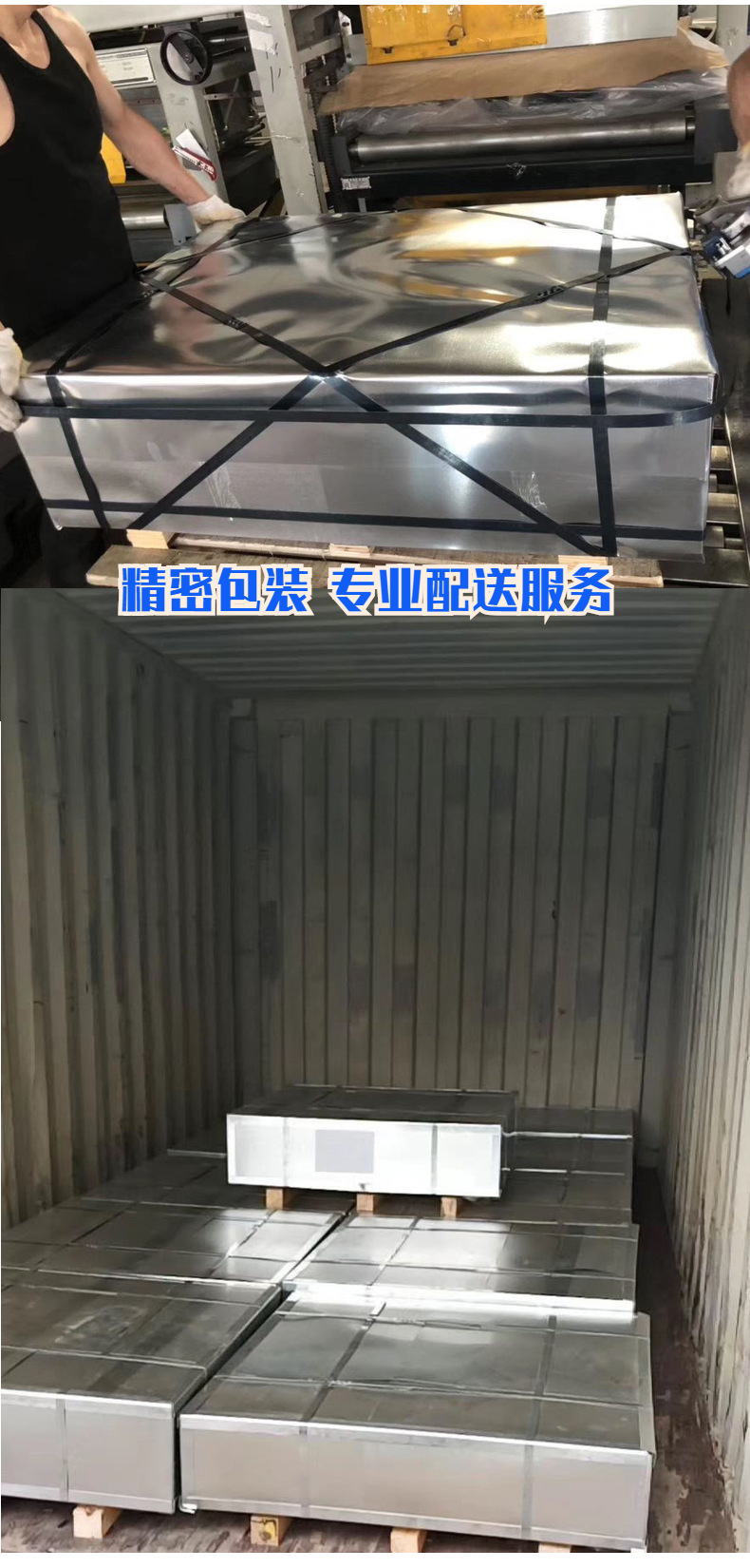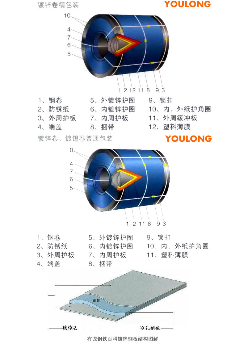 分为切成定尺长度的镀锌板和带卷镀锌板包装两种。一般铁皮包装,内衬防潮纸,外以铁腰子系缚,系缚牢固,以防内装镀锌板互相磨擦。