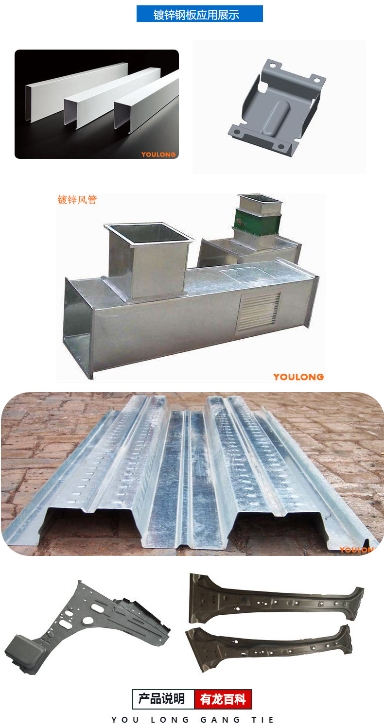镀锌板带钢产品主要应用于建筑、轻工、汽车、农牧渔业及商业等行业。其中建筑行业主要用于制造防腐蚀的工业及民用建筑屋面板、屋顶格栅等;轻工行业用其制造家电外壳、民用烟囱、厨房用具等,汽车行业主要用于制造轿车的耐腐蚀部件等;农牧渔业主要用做粮食储运、肉类及水产品的冷冻加工用具等;商业主要用作为物资的储运、包装用具等。