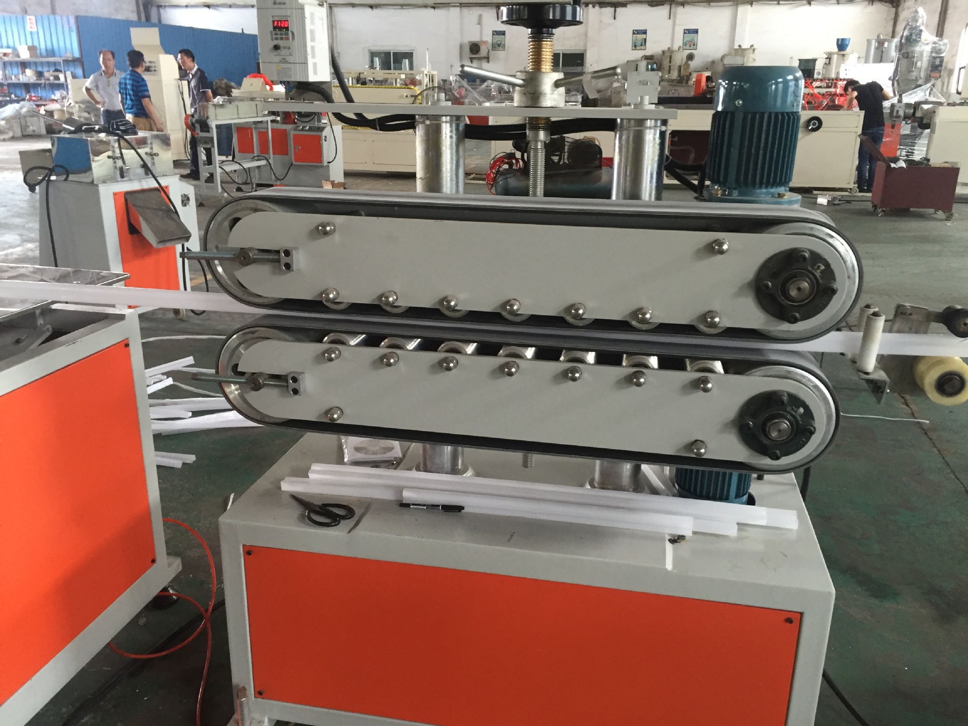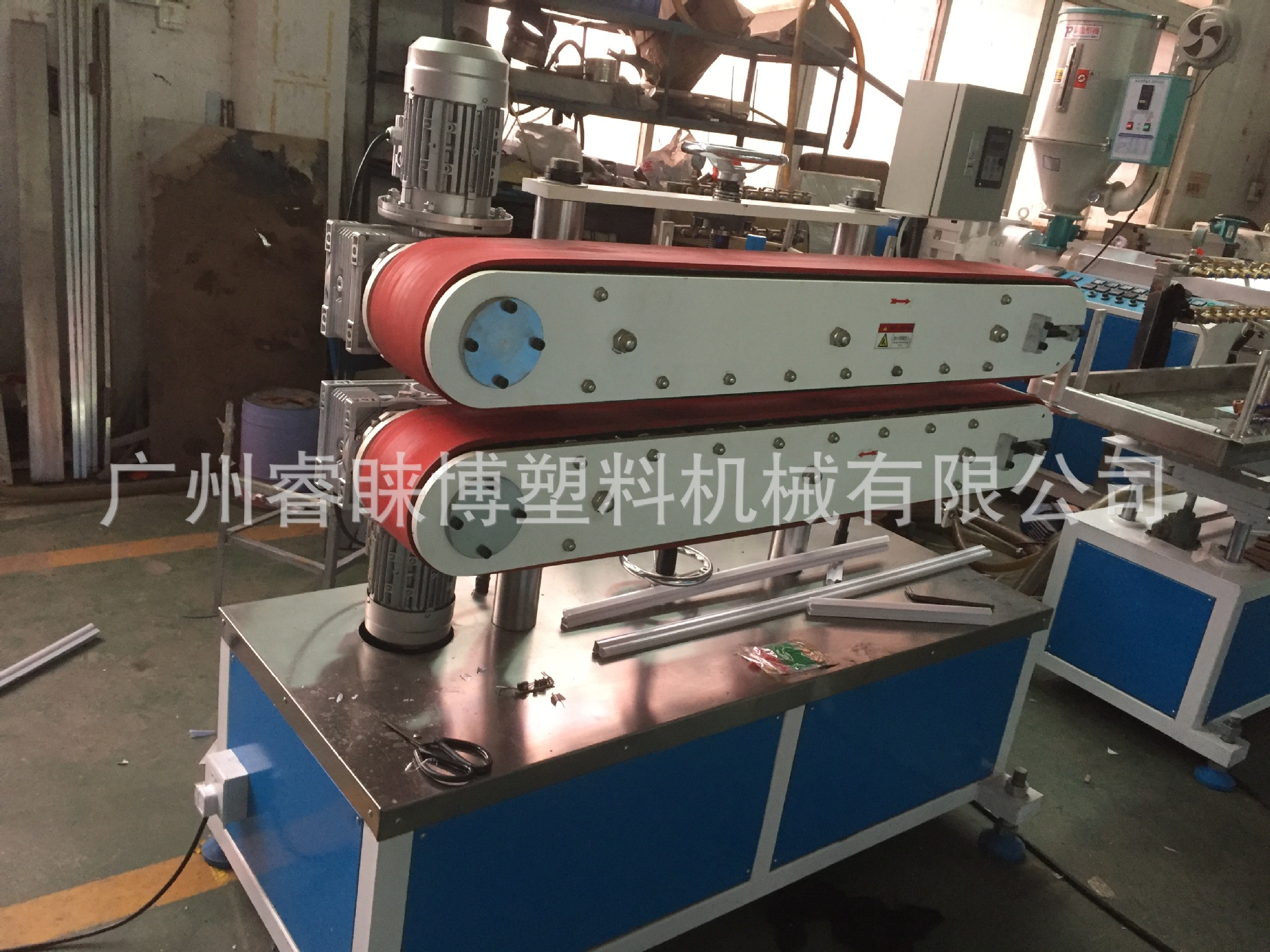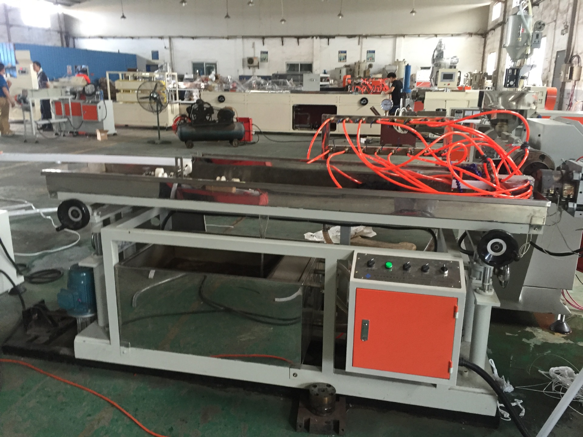 整条生产线由挤出机,定型模具,真空冷却系统,皮带牵引机,定长切断机,成品堆放架。
