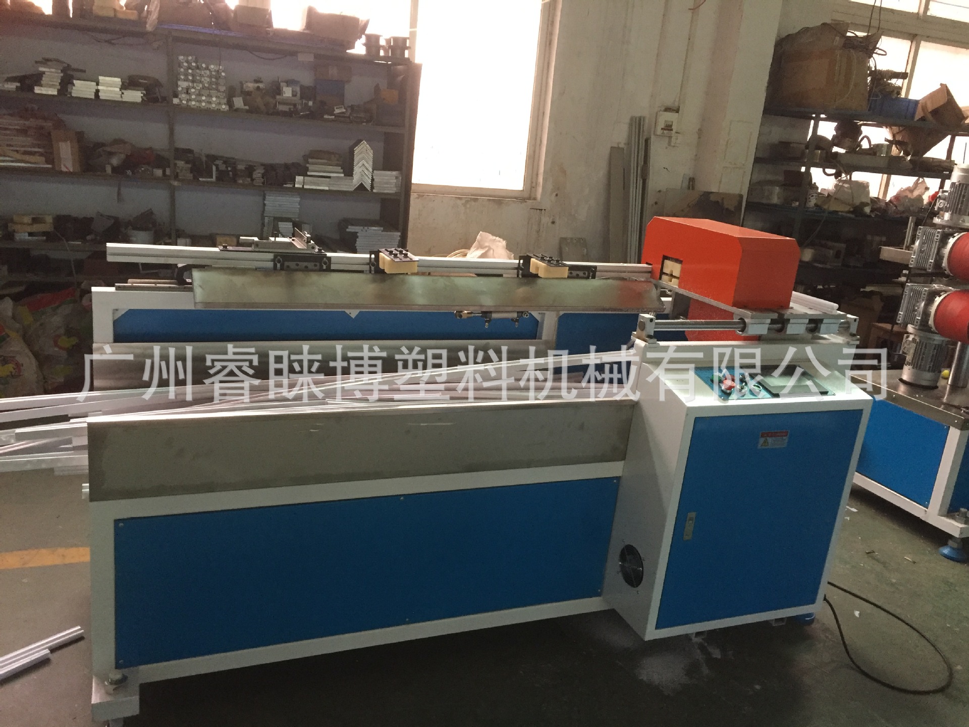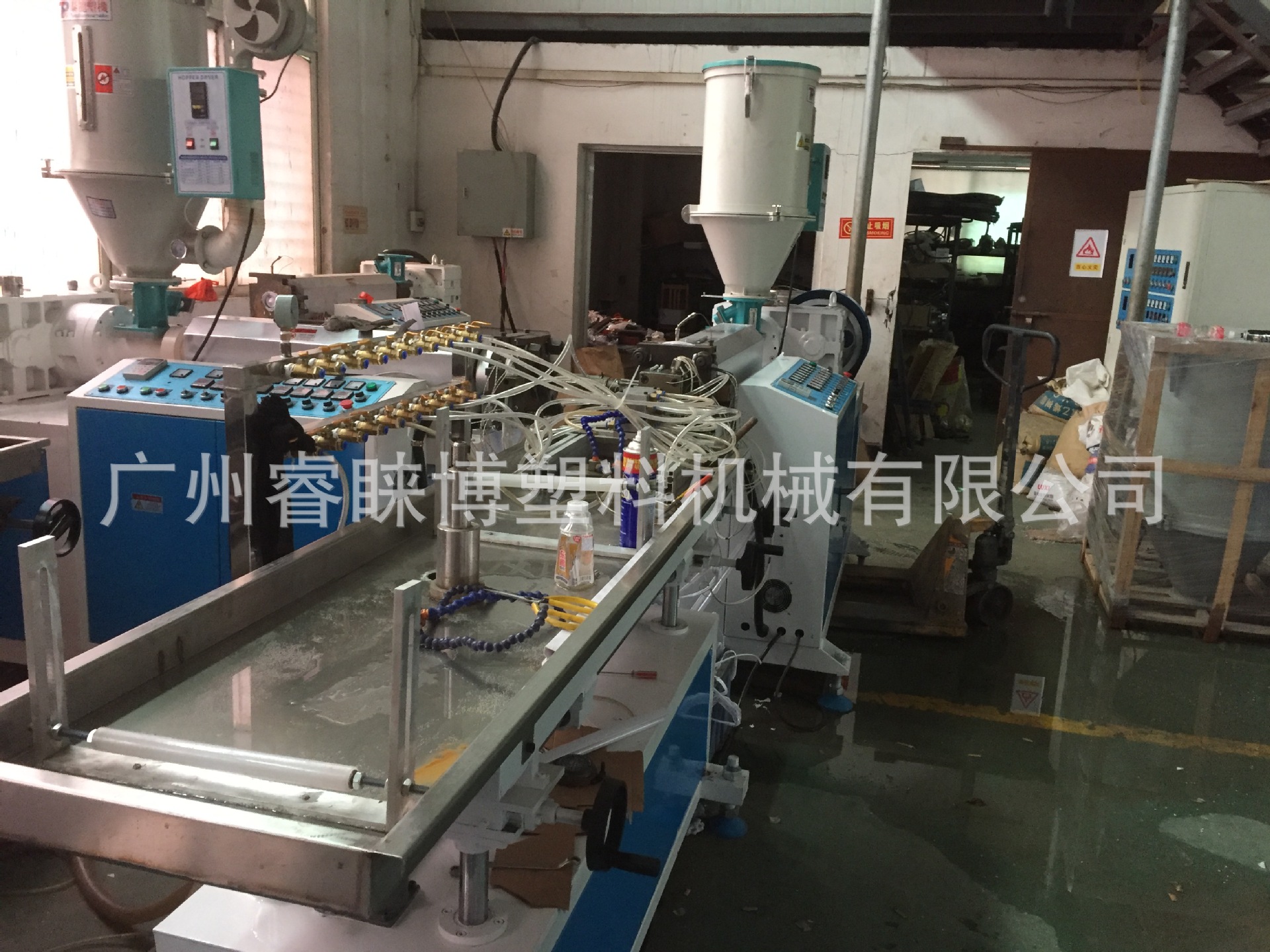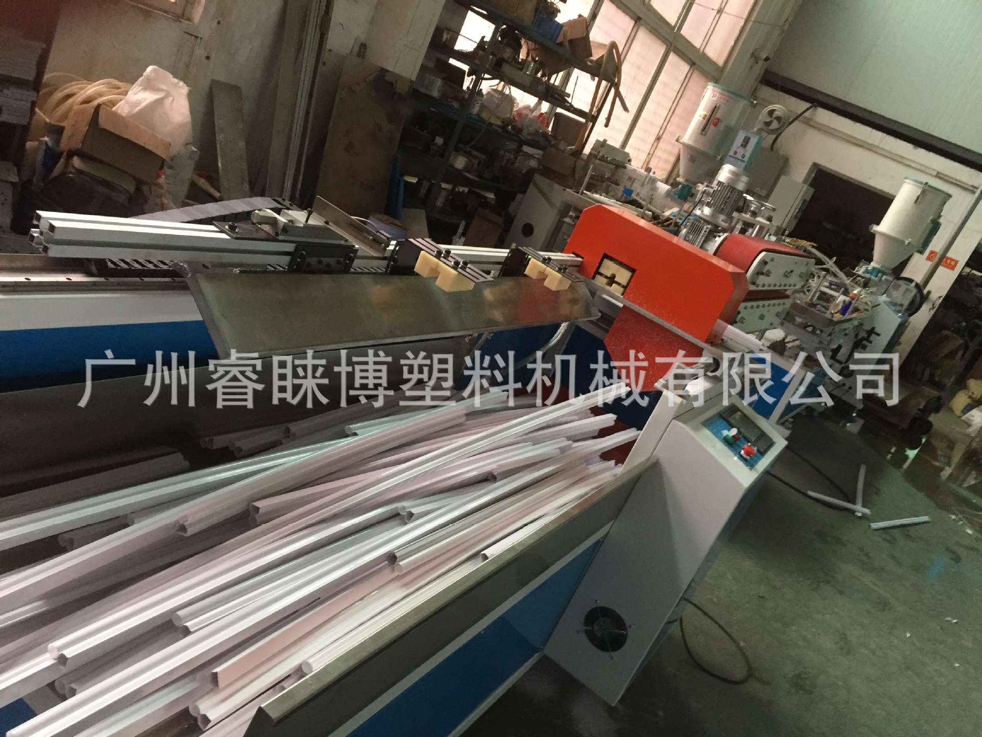 整条生产线由挤出机,定型模具,真空冷却系统,皮带牵引机,定长切断机,成品堆放架。
