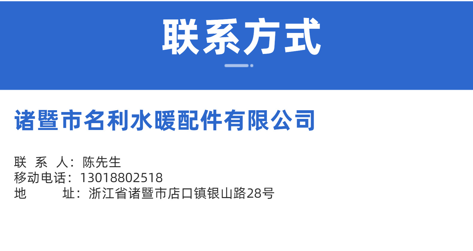 企业档案诸暨市名利水暖配件有限公司普通会员 绍兴 原厂/生产商/品牌方 |