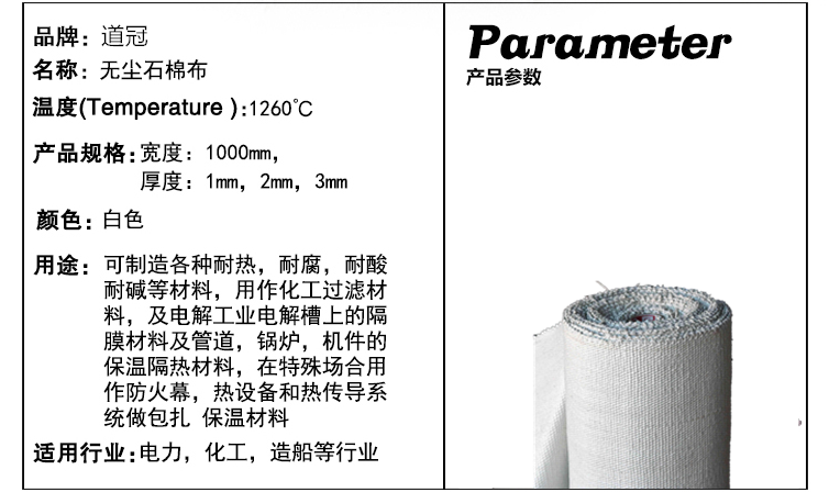 公告:产品是石棉线在药水里面编织,然后自然晾干,是会有点水汽的。石棉布属于工业产品,有气味,对气味过敏和家里使用慎拍。工业产品,家里用不了,这个是焊接铺地隔热防火,或管道保温,有很大味道。就算隔热不符合用途不要买,整卷退换货来回运费买家承担,裁零产品不能退换货,石棉布撕拉会坏,石棉布是软的厚度不标准,宽度只有900mm左右。这个是软的。我们没有标准厚度和标准尺寸石棉布。请亲知晓,谨慎购买