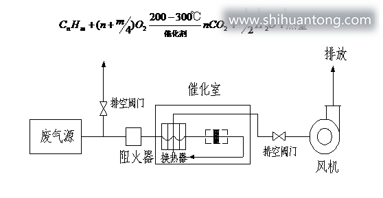 催化燃烧装置(RCO):首先通过除尘阻火系统。然后进入换热器,再送到加热室,使气体达到燃烧反应温度,再通过催化床的作用,使有机废气分解成二氧化碳和水,再进入换热器与低温气体进行热交换,使进入的气体温度升高达到反应温度。如达不到反应温度,加热系统科通过自控系统实现补偿加热。利用催化剂做中间体,使有机气体在较低的温度下,变成无害的水和二氧化碳气体,即:催化燃烧装置(RCO):首先通过除尘阻火系统。然后进入换热器,再送到加热室,使气体达到燃烧反应温度,再通过催化床的作用,使有机废气分解成二氧化碳和水,再进入换热器与低温气体进行热交换,使进入的气体温度升高达到反应温度。如达不到反应温度,加热系统科通过自控系统实现补偿加热。利用催化剂做中间体,使有机气体在较低的温度下,变成无害的水和二氧化碳气体,即: