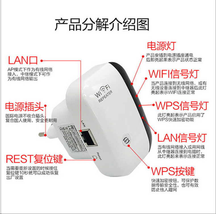 Wifi信号放大器,速度快,效率高,外壳采用的工程ABS+PC材料,耐摔,内置电源,迷你便携带,操作简单 !