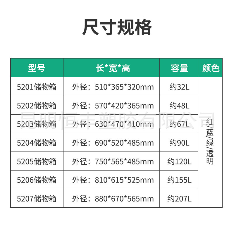 尺寸5201加厚款(四轮)【32L】(长510*宽365*高320mm),5202加厚款(四轮)【48L】(长570*宽420*高365mm),5203加厚款(四轮)【67L】(长630*宽470*高410mm),5204加厚款(四轮)【90L】(长690*宽520*高485mm),5205加厚款(六轮)【120L】(长750*宽565*高485mm),5206加厚款(六轮)【155L】(长810*宽615*高525mm),5207加厚款(六轮)【207L】(长880*宽670*高565mm)