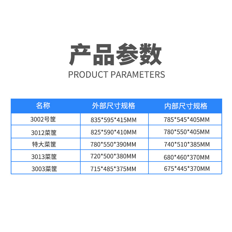 颜色3002菜筐【尺寸835*595*415mm】,3012菜筐【尺寸825*590*410mm】,特大菜筐【尺寸780*550*390mm】,3013菜筐【尺寸720*500*380mm】,3003菜筐【尺寸715*485*375mm】