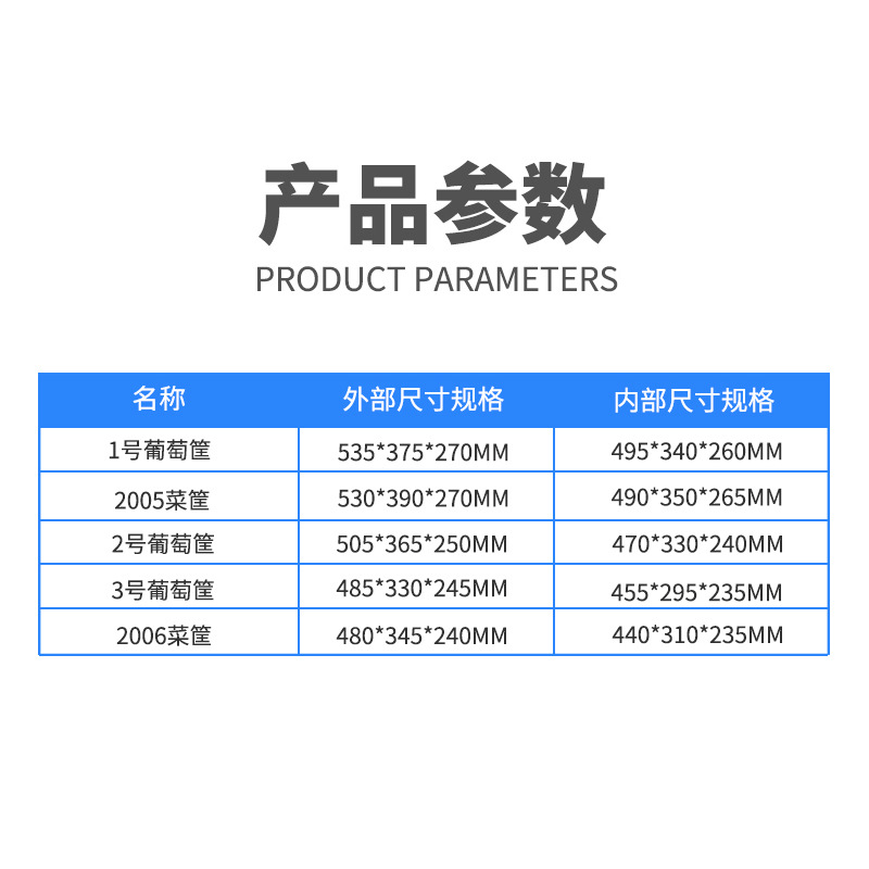 规格1#葡萄筐【尺寸535*375*270mm】,2005菜筐【尺寸530*390*270mm】,2#葡萄筐【尺寸505*365*250mm】,3#葡萄筐【尺寸485*330*245mm】,2006菜筐【尺寸480*345*240mm】