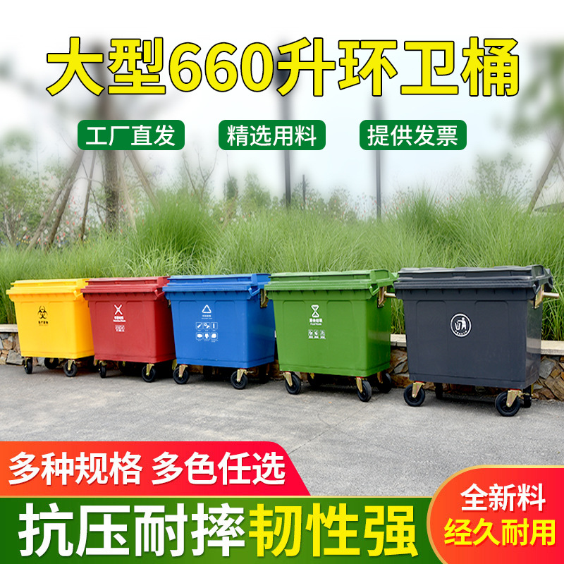 厂家直销定制印字专拍660L移动环卫垃圾车带轮户外移动垃圾桶批发