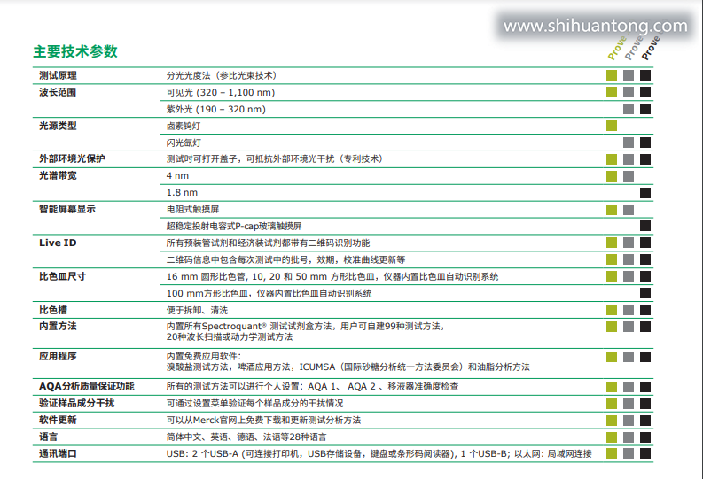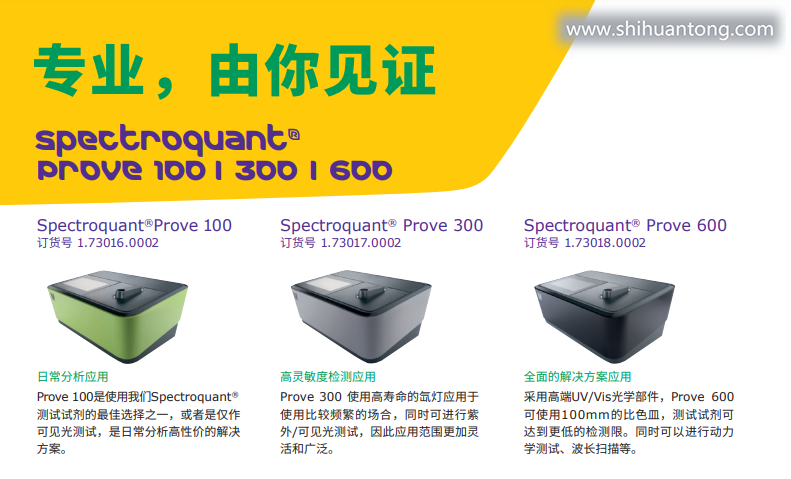 | Spectroquant®Prove实验室多参数水质分析仪 水中有什么危害的成分?是不是被污染了?这是一个十分重要和敏感的问题。当我们谈论废水、饮用水还是过程用水安全话题时,这些都对人类和环境健康至关重要,而且必须严格遵守我们国家法规要求和国家标准。 Spectroquant®Prove 100可在可见光光谱波段测试,可配套使用高质量的Spectroquant®预制试剂盒进行日常水质分析应用,如废水中的COD,氨氮,总磷,总氮等。 Spectroquant®Prove 300可在紫外-可见光光谱波段测试,采用长寿命的氙灯光源更加耐用,内置免费的应用方法可以进行生活饮用水、废水、过程用水分析等。 Spectroquant®Prove 600包含了所有Prove 300的功能,的UV/Vis光栅系统确保杰出的分辨率和灵敏度,它拥有1.8 nm的带宽,并可使100 mm比色皿进行痕量分析,如锅炉用水中的痕量二氧化硅、包装饮用水中的痕量溴酸盐等。 Prove100/300/600实验室多参数水质分析仪介绍:
