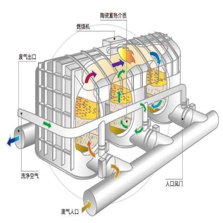 混合气流过温度略低的蓄热瓷器,很多热能即从烟气中迁移至蓄热体,用于加温下一次循环系统的有机废气,高溫烟气的本身温度大幅降低,再历经直膨式系统软件和别的物质产生热交换器,烟气温度进一步减少, 终排入户外空气。