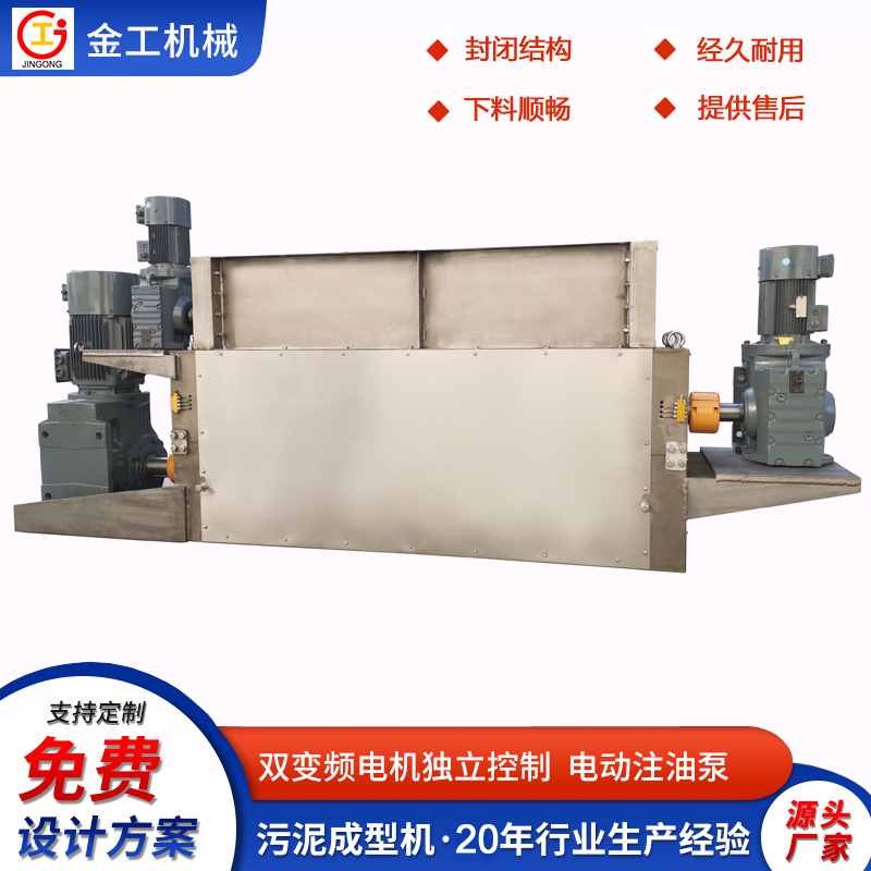 工作原理:是由两根方槽的刀轴互相啮合做相向运动,压滤过的污泥(含水率83%-45%)随着刀轴转动挤压在刀槽里形成方矩形,污泥随着刀轴转动由泥梳把它从刀槽铲刮出来,形成方条。
