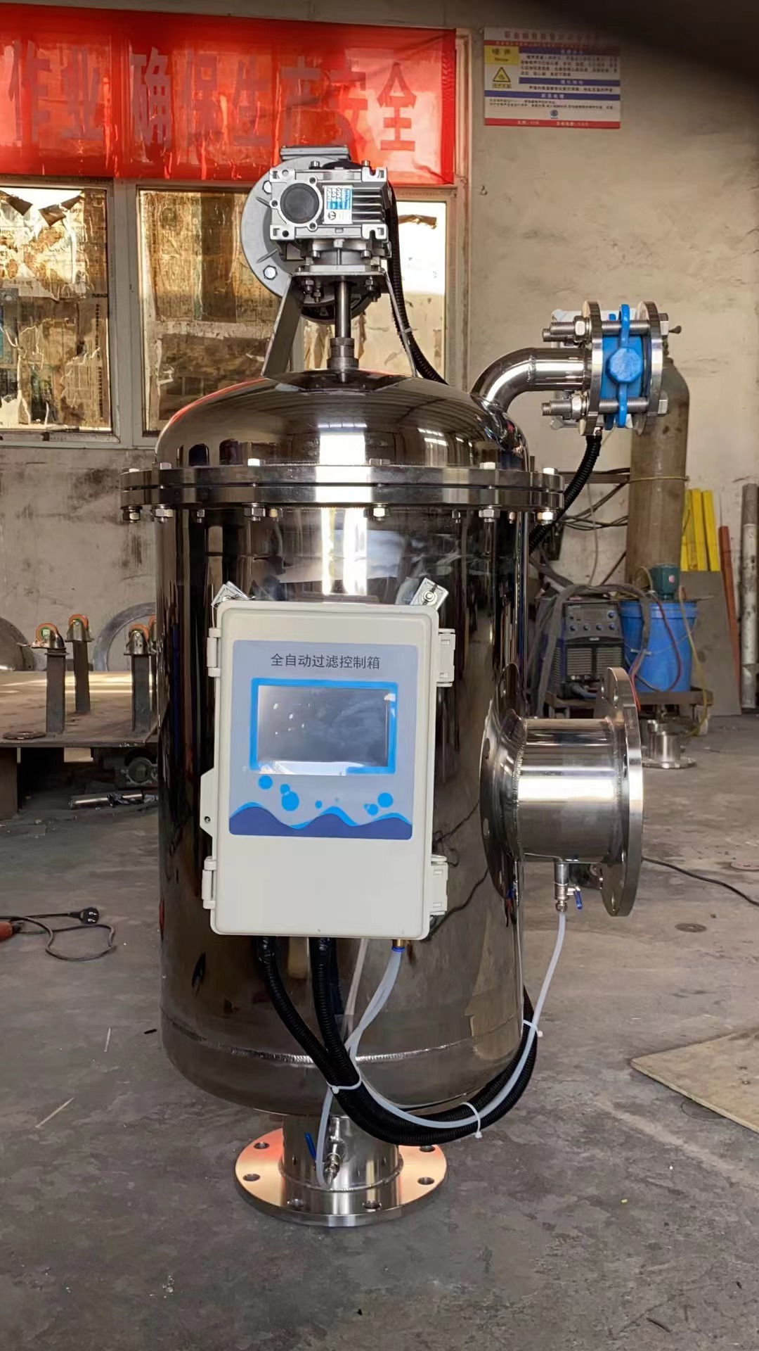 质及保护系统其他设备正常工作的精密设备。水由进水口进入自清洗过滤器机体,由于智能化(PLC、PAC)设计,系统可自动识别杂质沉积程度,给排污阀信号
