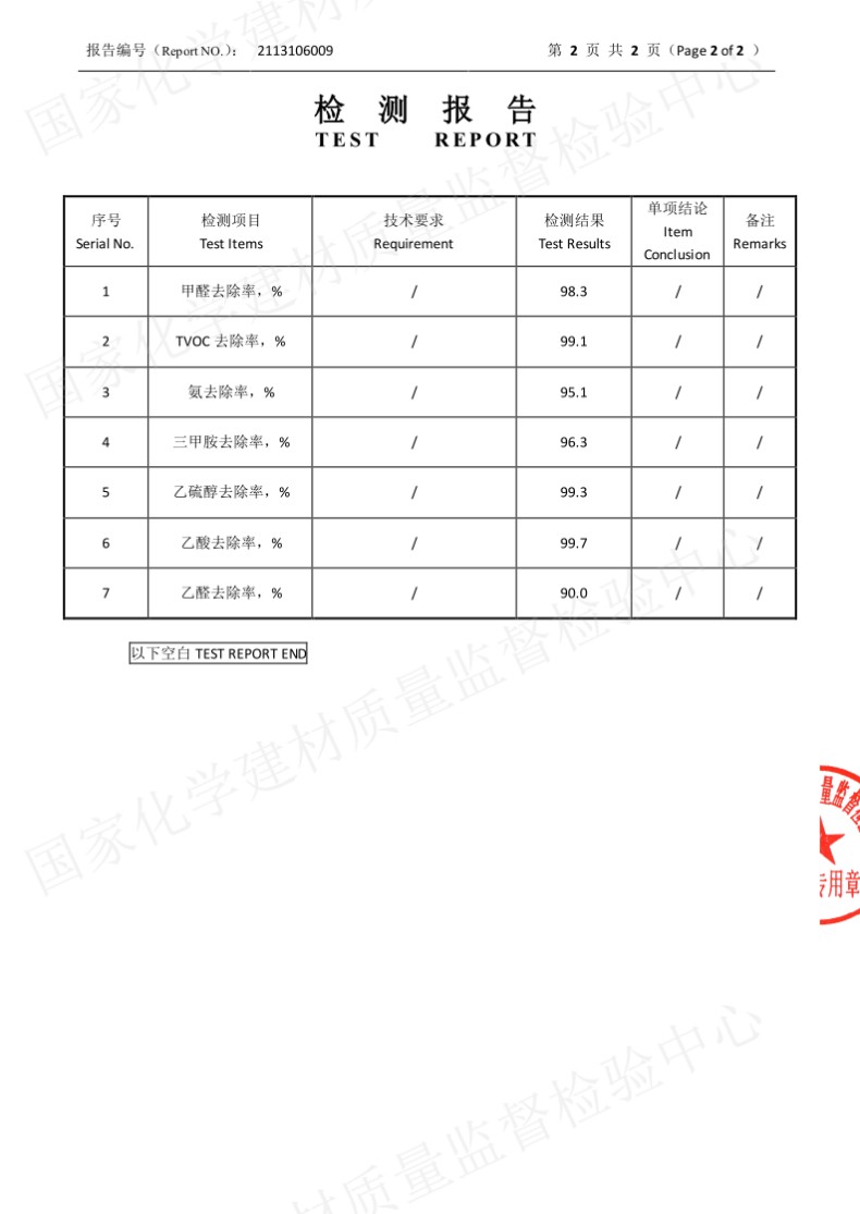 甲醛去除率:≥90%
