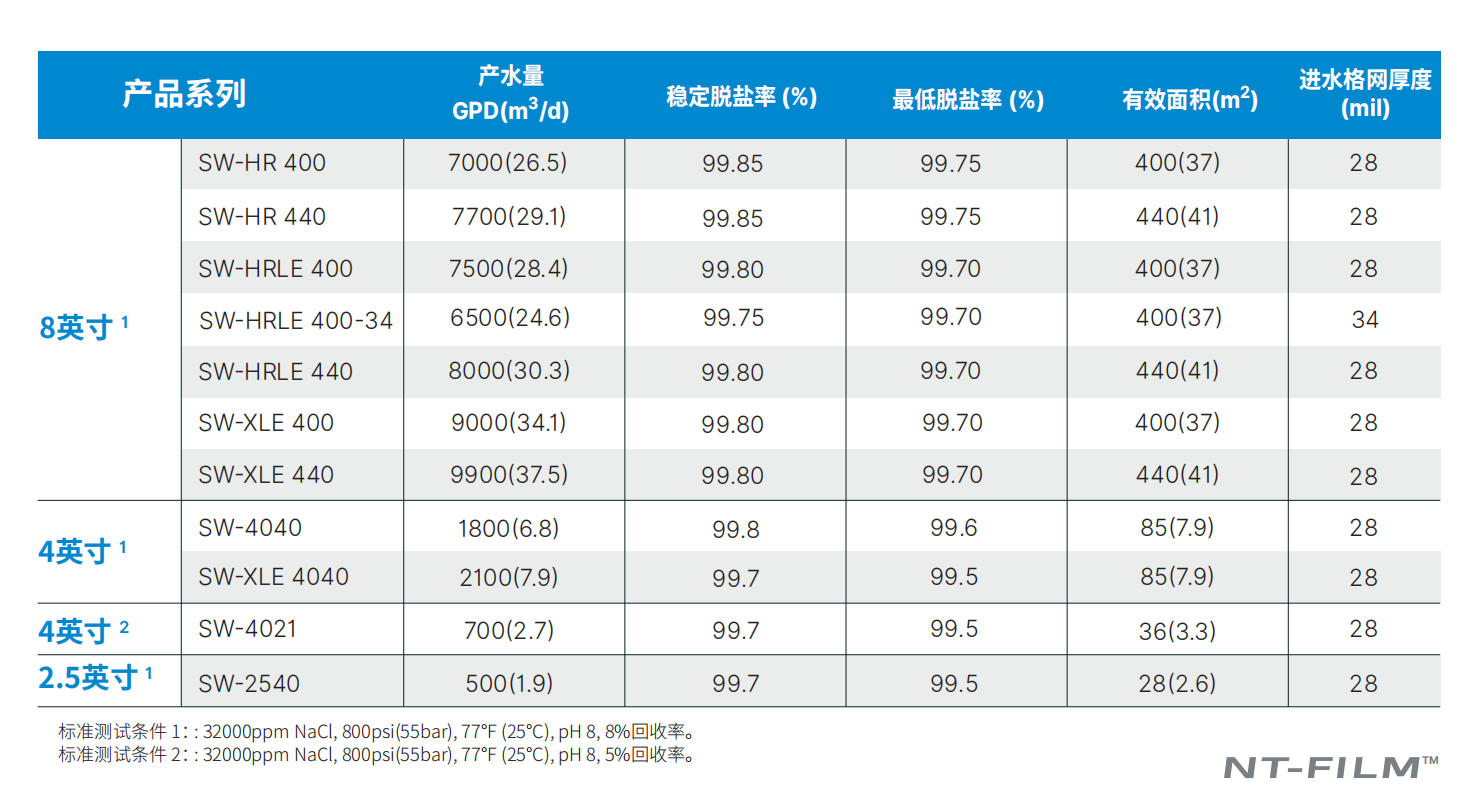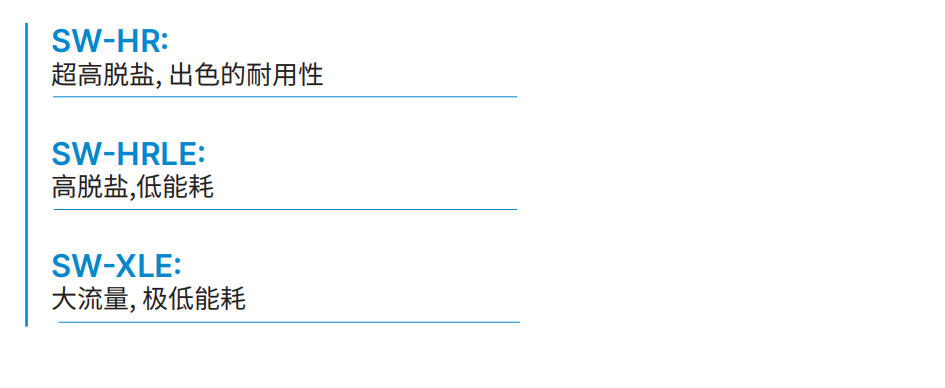 海水反渗透膜集高脱盐率和低能耗于一体,具有性能稳定,产水量稳定的特点,主要应用于海水淡化、含有高浓度盐的废水回用与近零排放处理、物料浓缩等领域。
