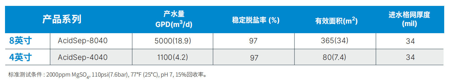 特种纳滤膜AcidSep专为强酸性条件下使用开发的特种纳滤膜产品,主要应用在实现酸性溶液中金属、 无机盐分离与浓缩,实现酸溶液的净化与回收。可适用于浓度为20%硫酸、20%盐酸、30%磷酸、 5%硝酸中。