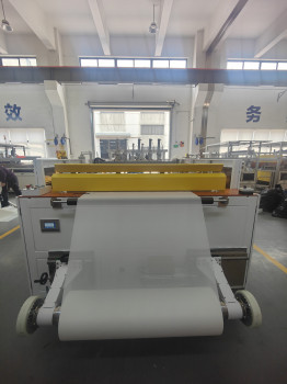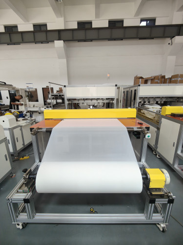 此条产线前道为卷膜部分,涉及裁膜叠膜、膜片打胶、导布焊接中心管、导布移栽、翻导布插膜片、卷膜、卷膜成品下线等工序,其中裁膜叠膜在