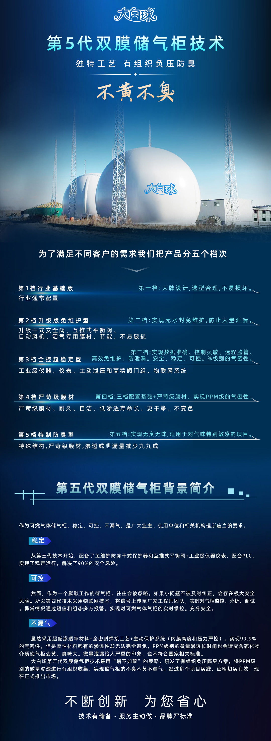技术方面,拥有十几项双膜储气柜的工艺技术。其中全密封焊接、微压安全阀、平衡阀等属于对双膜储气柜运行与安全有至关重要的作用研究。大白球双膜储气柜目前拥有第5代双膜储气柜技术,经过多年不懈努力,终于突破技术瓶颈。趋近于完满,能更好的解决双膜储气柜的行业痛点、难点,高阶产品 ,与众不同,超智能。