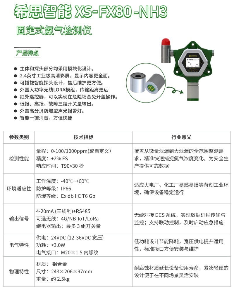 在众多气体检测设备供应商中,湖南希思智能科技有限公司的XS-FX80-NH3固定式氨气泄露报警器凭借其创新设计和卓越性能,成为烟气治理行业氨泄漏监测的理想选择。核心优势如下: